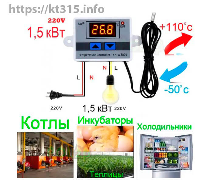 XH-W3001 – отличное и простое решение для решения вопроса регулировки температуры в желаемой среде. Регулятор может работать как в режиме нагрева, так и в режиме охлаждения. Прост в монтаже и настройке, удобный монтаж. Для подключения необходимо только подать питание 220В и подключить к выводам терморегулятора соответствующее устройство для обогрева (охлаждения), которым будет управлять терморегулятор.