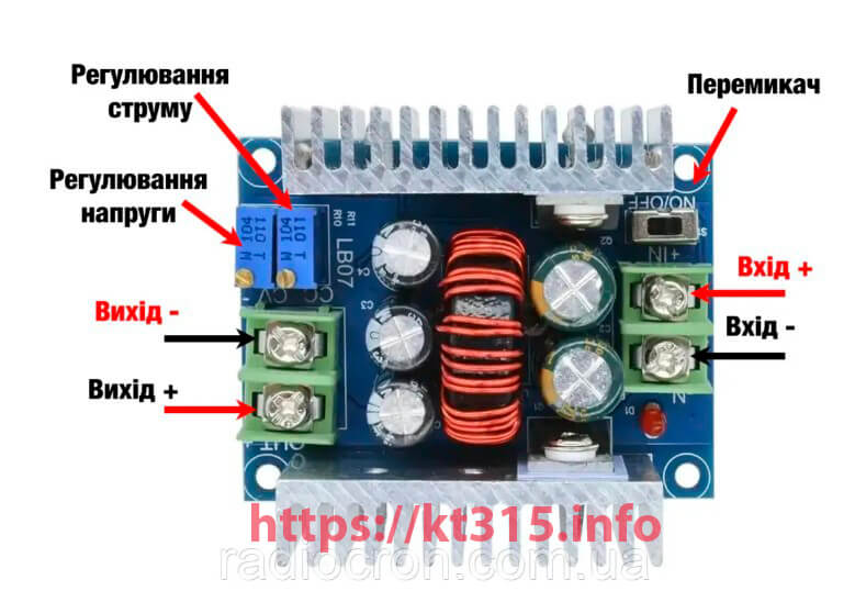 Преобразователь использует технологию широтно-импульсной модуляции (ШИМ) для эффективного понижения напряжения. С помощью потенциометра можно плавно настроить требуемое выходное напряжение.
