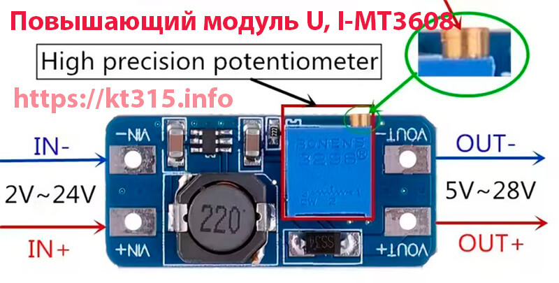 При подключении внешнего источника питания необходимо помнить, что значение входного напряжения должно быть ниже выходного напряжения. При первом включении преобразователя напряжения, для изменения выходного напряжения необходимо сделать большое количество оборотов (от 10 до 20 оборотов).