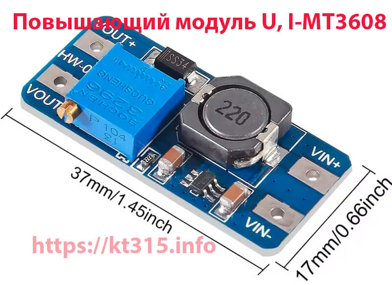Преобразователь построен на основе микросхемы MT3608, подстроечного резистора и прочих вспомогательных компонентов. Микросхема имеет 6 выводов и выполнена в корпусе «SOT23-6». Главным достоинство данного преобразователя является работа от 2 В напряжения постоянного тока. Выходная сила тока преобразователя напряжения составляет 2 А, а коэффициент полезного действия (КПД) до 93%. В микросхеме не предусмотрена защита ок короткого замыкания, но имеется защита от перегрева, при которой плата отключает входное напряжение. Регулировка выходного напряжения осуществляется с помощью подстроечного резистора