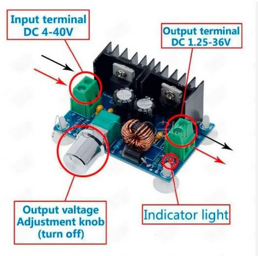 Метод регулирования напряжения: модуляция ШИМ. Модель переключателя: микросхема регулятора напряжения в коммутаторе XL4016, с двойным выпрямлением MBR20100, максимальный вход до 40 В, регулируемый выход 1,25-36 В.