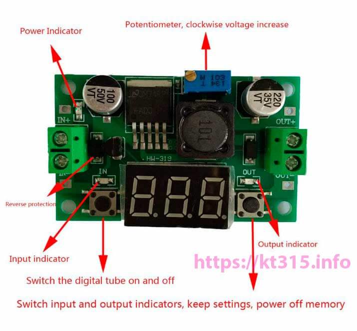 Модуль питания имеет компактные размеры, использует усовершенствованный микропроцессор PIC, погрешность вольтметра составляет 0,05 В. Регулятор напряжения: входное напряжение DC 4-40 В, выходное напряжение DC 1,25-37 В. Для регулировки напряжения необходимо повернуть потенциометр более 5 раз против часовой стрелки. Максимальный выходной ток может достигать 3 А, а нормальный стабильный рабочий ток составляет 2 А. Имеется светодиодный индикатор напряжения, который можно включать и выключать с помощью кнопки управления