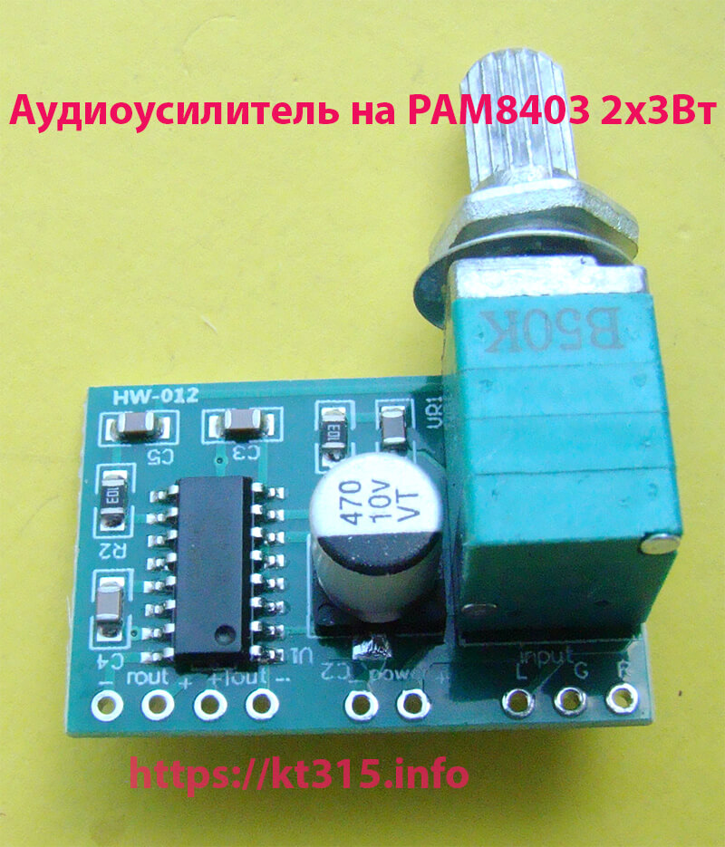 Маленький стерео усилитель D класса на микросхеме PAM8403 с регулятором громкости и с выходной мощностью до 3Вт на канал.